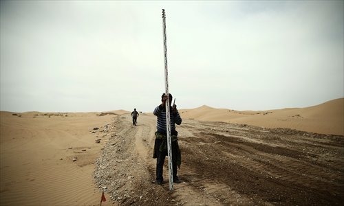 Workers survey the road being built in the Tenggeli desert, in the Inner Mongolia Autonomous Region. Photo: CFP