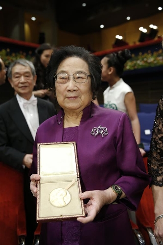 Tu, 84, received the Nobel medal, Nobel diploma and a document confirming the Nobel Prize amount from King XVI Gustaf of Sweden at the Stockholm Concert Hall.
