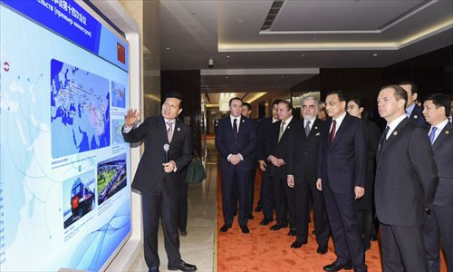 Chinese Premier Li Keqiang and foreign leaders attending the 14th Shanghai Cooperation Organization (SCO) prime ministers' meeting visit an exhibition on the outcome of cooperation between Henan Province and SCO member countries before a welcome banquet, in Zhengzhou, capital of central China's Henan Province, Dec. 14, 2015. Photo: Xinhua
