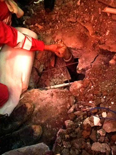 Tian Zeming, the 19-year-old survivor, buried under debris in the landslide at Hengtaiyu industrial park in Shenzhen, is pulled out by Luo Xingxing, a rescue worker from the Chinese People's Armed Police Resources Force in the early morning December 23. Tian is the first rescued survivor at the disaster site. Photo: CFP
