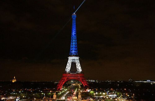 The Eiffel Tower is illuminated in the colors of the French flag to honor victims of Paris attacks on November 17, 2015 in Paris, France. At least 132 people were killed and some 350 injured in the terror attacks on November 13. Photo: Xinhua