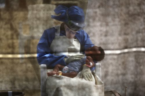 A medical worker, a survivor Ebola, from the aid group Doctors Without Borders treats a baby girl suspected of having contracting the virus in Liberia, January, 2015. Fortunately, the baby girl survived at last. Photo: yangtse.com - qq.com