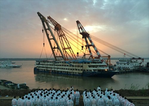 Over hundred rescuers pay tribute to the victims. The Eastern Star, which capsized June 1, 2015, is being hoisted from the river after rescuers righted it on June 6. The cruise ship left the eastern Chinese city of Nanjing bound for Chongqing Municipality on the upper reaches of the river, but sank "within one or two minutes" of being caught in freak weather in Jianli, Hubei Province of China, according to the ship's captain and chief engineer who survived the incident. The death toll from the sinking reaches 442, and 12 rescued. Photo: sina.com.cn
