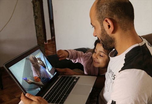 Abdul Halim al-Attar shows his daughter a photo taken in Summer, 2015. He is a Syrian refugee who was photographed selling pens in the streets of Beirut with his daughter sleeping on his shoulder. His life was more difficult then and his daughter was only 4 years old. Now, he runs three businesses and helps other refugees after an online crowd-funding campaign in his name and collected $191,000. Photo: yangtse.com - qq.com