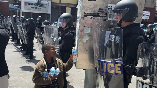 An African American boy gives bottled water to armed riot policemen in Baltimore, Maryland, USA. Mourners gathered to remember a 25-year-old African American man who died a week later after being taken into police custody. The unexplained death brought thousands of protesters to the city's streets in protest of police violence. Photo: yangtse.com-qq.com