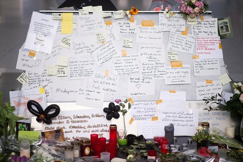 A memorial with messages, candles, and flowers for the victims of the Germanwings plane crash in the French Alps can be seen at the airport in Düsseldorf on March 28, 2015. Photo: CFP