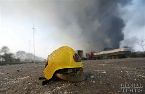 A safety helmet left on the ground by firefighters. The dark smoke rises from the debris of two severe explosions at Binhai new district in Tianjin, China, August 12, 2015. Photo: Cui Meng/GT