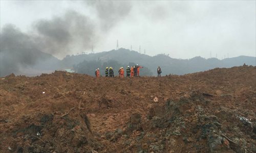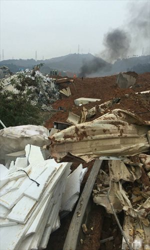 Four people have been pulled out of debris and 22 remain missing after a landslide hit an industrial park collapsing 22 buildings Sunday in Shenzhen city of South China's Guangdong Province. Photo:sznews.com