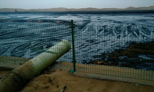 View of a massive sewage lagoon filled with polluted water in the Tengger Desert in Alashan, North China's Inner Mongolia Autonomous Region on August 29, 2014. Photo: IC