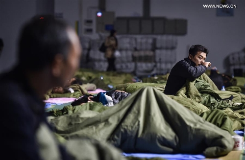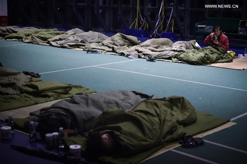Evacuated people rest at a makeshift shelter place located at a sports center in Shenzhen, south China's Guangdong Province, Dec. 21, 2015. A total of 59 people went missing by 11 p.m., after a landslide buried 33 buildings in an industrial park in Shenzhen city of south China's Guangdong Province on Sunday, according to local authorities. Around 900 people has been evacuated as of 5 p.m. Sunday. (Xinhua/ Mao Siqian)