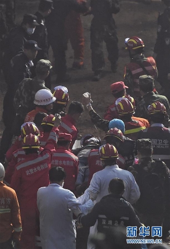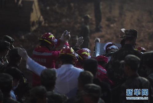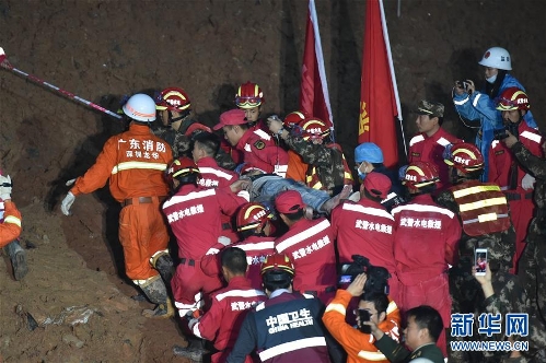 One man was pulled out alive early Wednesday morning more than 60 hours after a landslide in the southern city of Shenzhen, south China's Guangdong Province, Dec. 23, 2015. Survivor was conscious, but his leg injured.