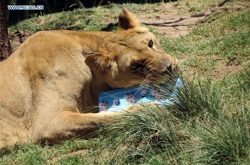 Image provided by Buin Park Zoo shows a lion opening its Christmas gift, in the Buin Park Zoo, located in the commune of Buin, Chile, on Dec. 22, 2015. (Xinhua/Buin Zoo)