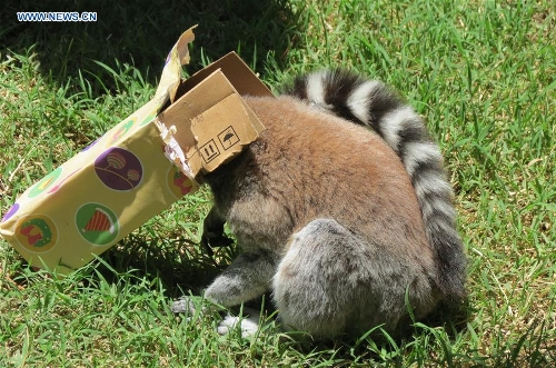 Image provided by Buin Park Zoo shows a ring-tailed lemur holding its Christmas gift, in the Buin Park Zoo, located in the commune of Buin, Chile, on Dec. 22, 2015. (Xinhua/Buin Zoo)