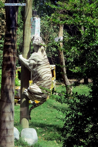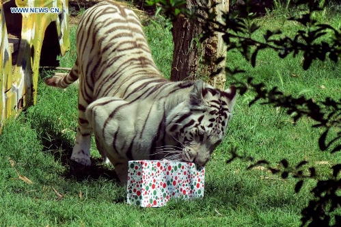 Image provided by Buin Park Zoo shows a Bengal tiger opening its Christmas gift, in the Buin Park Zoo, located in the commune of Buin, Chile, on Dec. 22, 2015. (Xinhua/Buin Zoo)