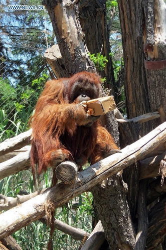 Image provided by Buin Park Zoo shows an orangutan opening its Christmas gift, in the Buin Park Zoo, located in the commune of Buin, Chile, on Dec. 22, 2015. (Xinhua/Buin Zoo)