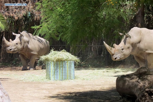 Image provided by Buin Park Zoo shows rhinoceros watching their Christmas gift, in the Buin Park Zoo, located in the commune of Buin, Chile, on Dec. 22, 2015. (Xinhua/Buin Zoo)