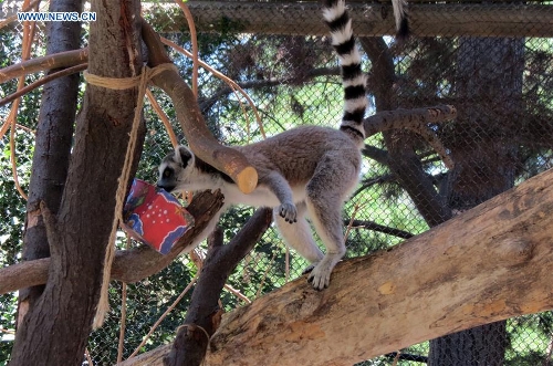 Image provided by Buin Park Zoo shows a ring-tailed lemur eating its Christmas gift, in the Buin Park Zoo, located in the commune of Buin, Chile, on Dec. 22, 2015. (Xinhua/Buin Zoo)