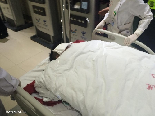 Tian Zeming, a survivor found in the landslide site, receives medical treatment at a hospital in Shenzhen, south China's Guangdong Province, Dec. 23, 2015. Tian was pulled out alive early Wednesday morning more than 60 hours after a landslide in Shenzhen. (Xinhua/Sun Fei)