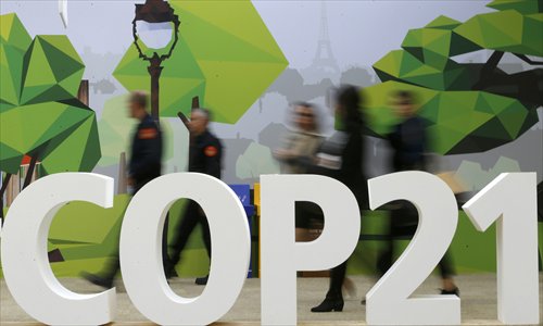 People walk past the COP21 logo in the Climate Generations area during the World Climate Change Conference 2015 (COP21) at Le Bourget, near Paris, on December 1. Photos: CFP