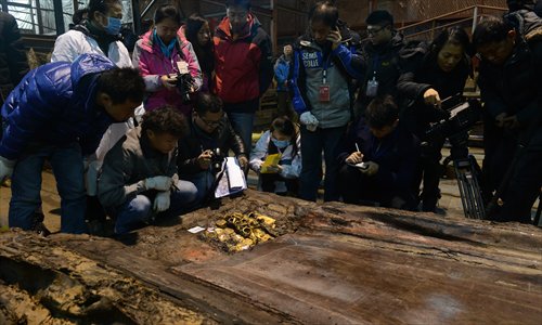 Archeologists show journalists gold items found at the Haihunhou burial site that dates back 2,000 years.Photo: CFP