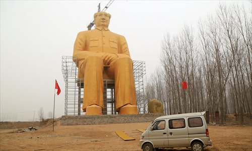 Construction of a 36-meter-high statue of late Chinese leader Mao Zedong in Zhushigang village, Kaifeng, Central China's Henan Province, nears completion on Monday. The statue, made from reinforced concrete, will be painted gold and has cost several entrepreneurs about 3 million yuan ($459,300). Photo: CFP