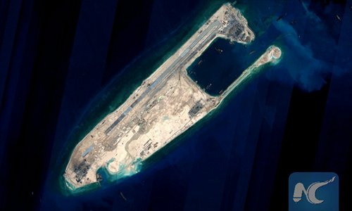 Satellite image shows the Yongshu reef of the Nansha Islands after a land reclamation project in south China. Photo: Xinhua