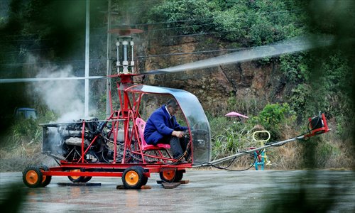 Jiang Changyin, a farmer in his 50s, pilots a self-made helicopter on a test flight in Dexing, East China's Jiangxi Province on Wednesday. The 2.65-meter-high and 2.5-meter-long helicopter, which weighs 650 kilograms, took him three years and some 200,000 yuan ($30,520) to build. The test ended in failure due to the slow revolving speed of the propeller and a lack of engine power. Photo: CFP