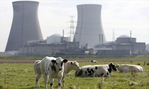 Cows are seen in a field near cooling towers of Doel's nuclear plant in northern Belgium. Photo: CFP