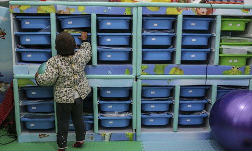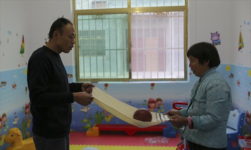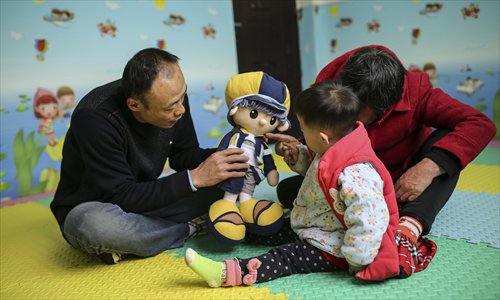 Family planning official Li Bo plays with a baby in a child-rearing center in Danfeng, Shaanxi Province. The child-rearing project is aimed at improving parenting in rural areas. Photo: IC