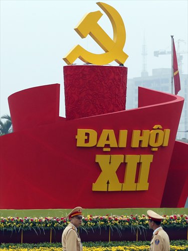 Traffic police officers stand in front of a decoration with the communist logo promoting the 12th National Congress of the Communist Party of Vietnam before its preparatory session at the national convention center in Hanoi on Wednesday. Photo: AFP