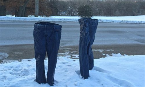Frozen jeans stand by a road in Minneapolis, Minnesota, US. An area resident placed the icy pants at different spots in the city. The photos soon went viral and kicked off a viral trend on social media. Photo: Facebook