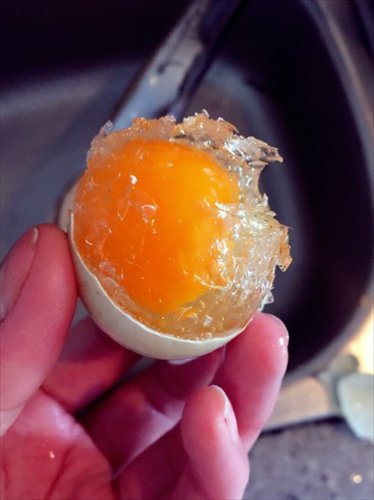 A Weibo user posted two photos of a raw egg on Sunday that had completely frozen through.