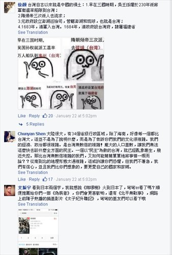 Over the weekend, a gradual shift in tone occurred. Instead of arguing back and forth, netizens across the Straits started discussing food, travel, TV shows, and many even started posting their own photos and turned the Facebook "battlegrounds" into dating sites. People from Taiwan also joined the groups and started asking questions about the mainland.