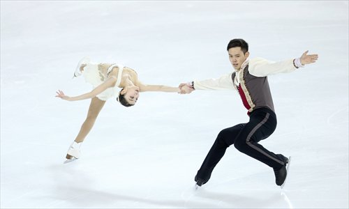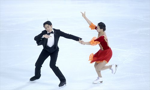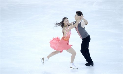 Figure skaters Yu Xiaoyang and Wang Chen from Harbin compete in the short dance on Tuesday in Urumqi, Northwest China’s Xinjiang Uyghur Autonomous Region. Photo: Cui Meng/GT
