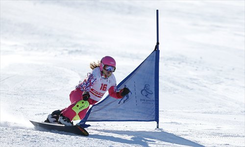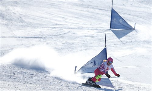 Niu Jiaqi from Jilin Province competes in the final of the women's parallel giant slalom at the National Winter Games on Tuesday in Urumqi, Northwest China's Xinjiang Uyghur Autonomous Region. Niu won gold of the event. Photo: Cui Meng/GT