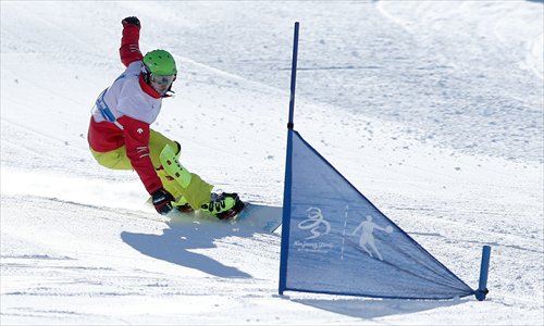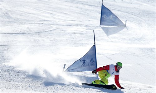 Bi Ye from Changchun Province competes in the final of the men’s parallel giant slalom at the National Winter Games on Tuesday in Urumqi, Northwest China’s Xinjiang Uyghur Autonomous Region. Bi won gold of the event. Photo: Cui Meng/GT