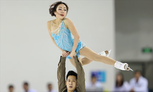 Sui Wenjing (top) and Han Cong of Team Harbin compete in the pairs free skating during the 13th Chinese National Winter Games in Urumqi, capital of Northwest China's Xinjiang Uyghur Autonomous Region. The duo, who won the title with 236.56 points, scored 154.02 points in free skating after leading the short program with 82.54 points. Photo: Cui Meng/GT