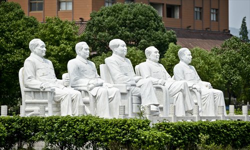 Sculptures of Mao Zedong, Zhou Enlai, Zhu De, Liu Shaoqi and Deng Xiaoping in Huaxi village. Photo: CFP