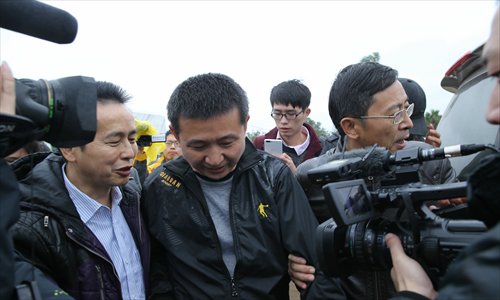 Chen Man (center), accompanied by his lawyer and surrounded by reporters, walks out of a prison in Haikou, Hainan Province on Monday. Photo: CFP
