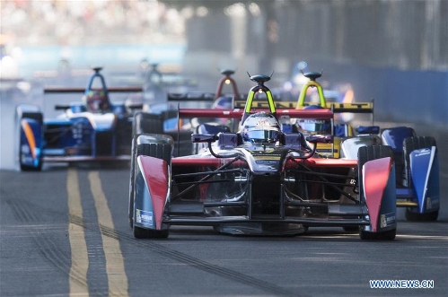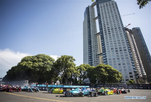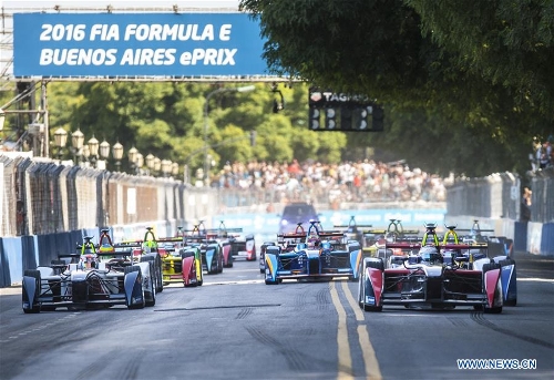 Drivers compete during the race of 2016 FIA Formula E Buenos Aires ePrix, in Buenos Aires, Argentina, on Feb. 6, 2016. Sam Bird of DS Virgin team claimed the title with 45:28.385. (Xinhua/Martin Zabala)