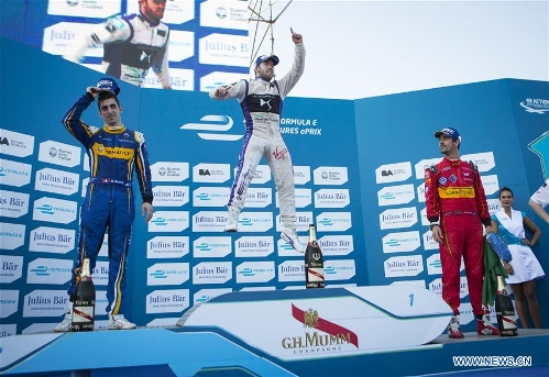 British driver Sam Bird (C) of DS Virgin team, celebrates with Swiss Sebastien Buemi (L) of Renault e.Dams team and Brazilian Lucas Di Grassi (R) of ABT Schaeffler team during the award ceremony of 2016 FIA Formula E Buenos Aires ePrix, in Buenos Aires, Argentina, on Feb. 6, 2016. Sam Bird claimed the title with 45:28.385.(Xinhua/Martin Zabala)