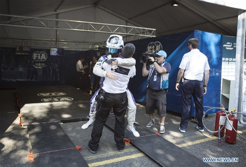 British driver Sam Bird (C) of DS Virgin team, celebrates with co-worker after 2016 FIA Formula E Buenos Aires ePrix, in Buenos Aires, Argentina, on Feb. 6, 2016. Sam Bird claimed the title with 45:28.385. (Xinhua/Martin Zabala)