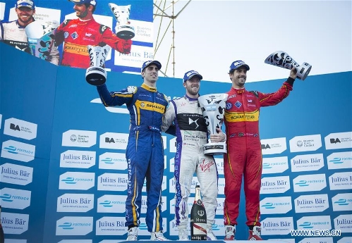 British driver Sam Bird (C) of DS Virgin team, celebrates with Swiss Sebastien Buemi (L) of Renault e.Dams team and Brazilian Lucas Di Grassi of ABT Schaeffler team during the award ceremony of 2016 FIA Formula E Buenos Aires ePrix, in Buenos Aires, Argentina, on Feb. 6, 2016. Sam Bird claimed the title with 45:28.385. (Xinhua/Martin Zabala)