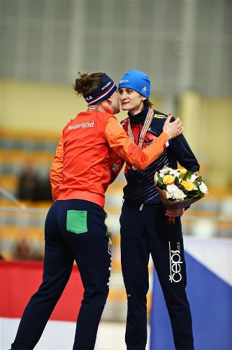 KOLOMNA, Feb. 12, 2016 (Xinhua) -- Czech speed skater Martina Sablikova (R) and Ireen Wust from the Netherlands congratulate each other on awarding ceremony during 3000m distance in World Single Distances Speed Skating Championships in Kolomna, Russia, on Feb. 11, 2016. Martina Sablikova claimed the title in 4:03.05.(Xinhua/Evgeny Sinitsyn) 11