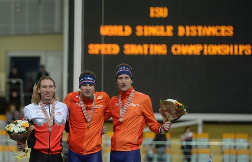 KOLOMNA, Feb. 12, 2016 (Xinhua) -- Silver medalist Ted-Jan Bloemen from Canada, Gold medalist Sven Kramer from Netherland and Bronze medalist Erik Jan Kooiman (From L to R) react on awarding ceremony after 10000m distance at World Single Distances Speed Skating Championships in Kolomna, Russia, on Feb. 11, 2016. Sven Kramer claimed the title in 12:56.77. (Xinhua/Evgeny Sinitsyn) 13