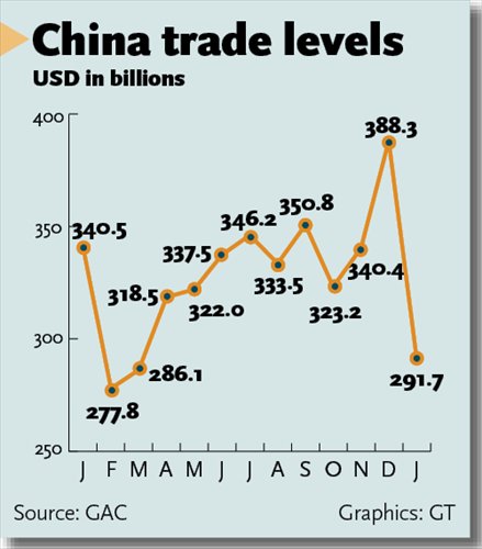"Retail sales during the Spring Festival holidays increased by 11.2 percent from last year, which suggests consumption remains stable. And the slump in trade reflects fewer investments, possibly from weaker property investments and measures to reduce overcapacity," Japanese financial company Nomura said in a research note sent to the Global Times Monday.