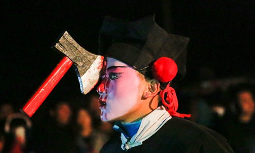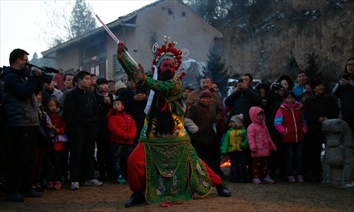 Artist Yan Chunlin performs as Guan Yu from the Romance of the Three Kingdoms during a Shehuo performance. Photo: IC