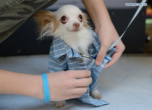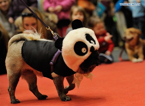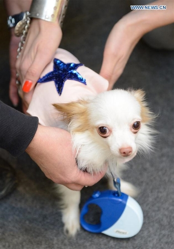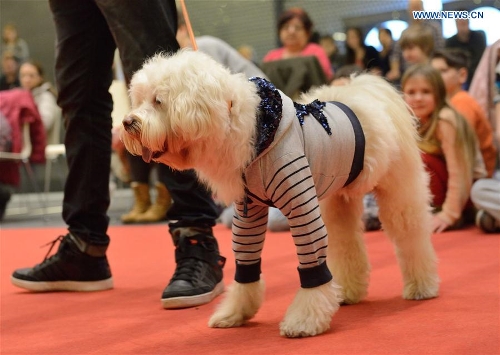 A dressed up pet dog is seen on stage during a dog fashion show event of the 2016 Pet Fair in Zagreb, capital of Croatia, Feb. 21, 2016. A total of 20 dogs presented the latest fashion created by Croatian fashion designer Boris Banovic during the show. (Xinhua/Miso Lisanin)