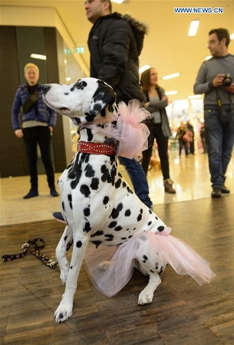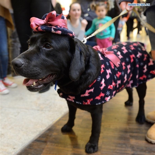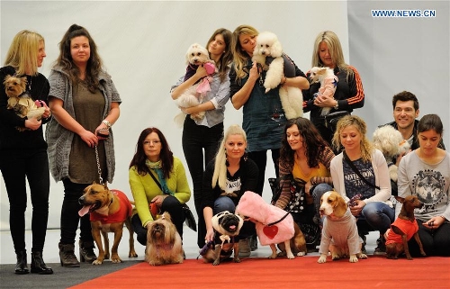 Dressed up pet dogs are seen on stage during a dog fashion show event of the 2016 Pet Fair in Zagreb, capital of Croatia, Feb. 21, 2016. A total of 20 dogs presented the latest fashion created by Croatian fashion designer Boris Banovic during the show. (Xinhua/Miso Lisanin)