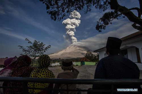 Residents watch volcanic smoking and ashes rising from Mount Sinabung during an eruption in Karo, North Sumatra, Indonesia, Feb. 24, 2016. Authorities have repeatedly called on local residents to remain patient in dealing with the impact of Sinabung's eruptions, which some experts have predicted will continue for five more years. (Xinhua/YT Haryanto)